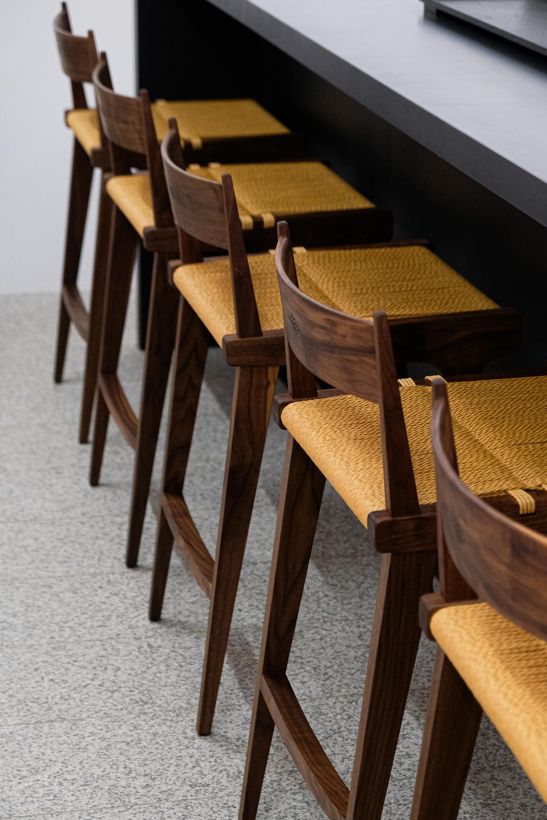공간의 분위기와 어우러지면서도 조용한 포인트가 되어 줄 수 있도록 단단하고 색이 깊은 월넛으로 제작한 바체어입니다. 브랜드의 심볼을 새긴 낮은 등받이는 실용성과 디테일을 더하며, 넓고 안정감있는 좌판은 지끈으로 엮어 편안한 착석감을 전해줍니다.